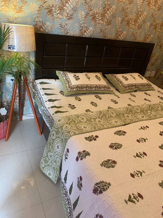 Transform your bedroom into a haven of elegance with the exquisite Sanganeri Block Printing Quilt Set. This beautiful ensemble features a stunning quilt, a soft bedsheet, and two matching pillow covers, all adorned with intricate Sanganeri block prints that reflect traditional craftsmanship. Crafted from premium quality cotton, this set not only adds a touch of artistic flair to your decor but also ensures a cozy and comfortable sleep experience. With its vibrant colors and detailed patterns, the Sanganeri Block Printing Quilt Set is perfect for those who appreciate timeless design and cultural heritage.